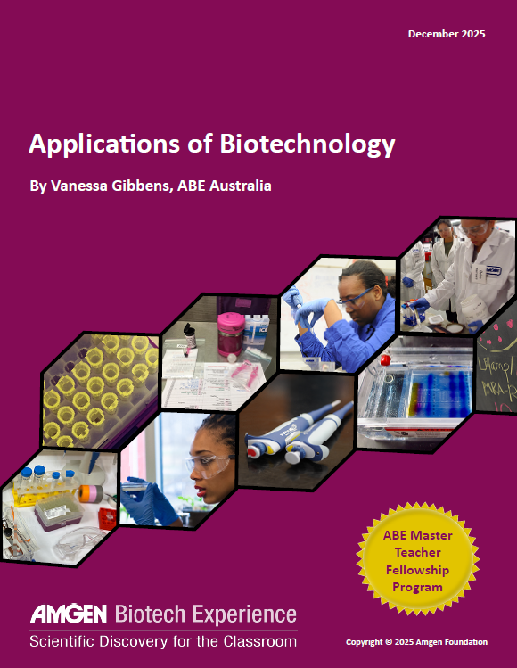In this engaging unit, developed by ABE Australia Master Teacher Fellow Vanessa Gibbens, students explore real-world applications of biotechnology. Through hands-on use of biotechnology techniques such as PCR, gel electrophoresis, and bioinformatics, students become more familiar with the ways biotech is relevant in their lives. Students complete the unit with a self-directed research project, applying their understanding to modern challenges in health, agriculture, the environment, or a topic of their choice.